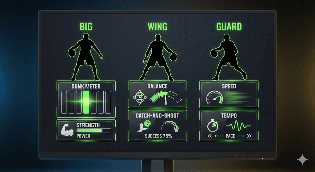 Each build stores its own tuning: shooting logic, tempo, meter dunk timing, and assist behavior. Example builds: Big (Inside), Stretch Big, Wing, Guard, Aggressive Variants, Clutch Mode, Custom Build.